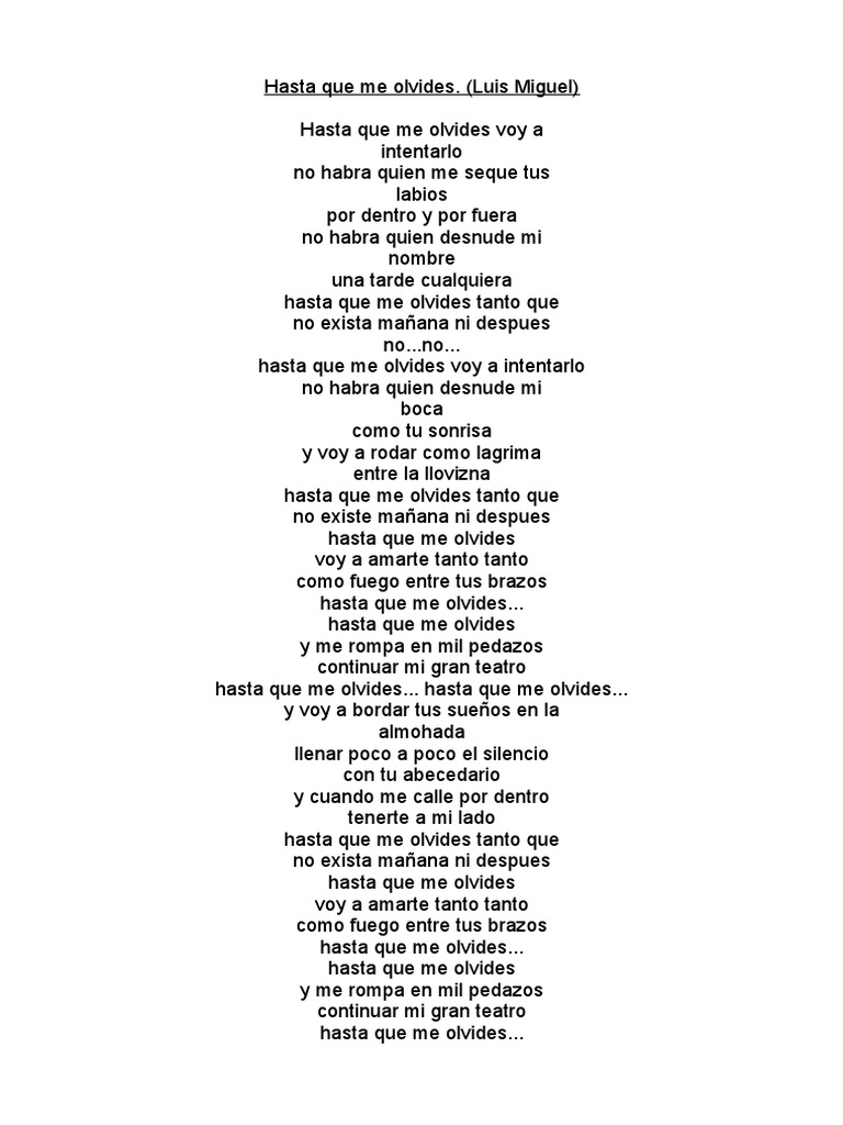 Hasta que me olvides voy a intentarlo no habra quien me seque tus labios por dentro y por fuera no habra quien desnude mi nombre una tarde llenar poco a poco el silencio con tu abecedario y cuando me calle por dentro tenerte a mi lado hasta que me olvides tanto que no exista mañana ni despues. Hasta que me olvides, voy a intentarlo, no habrá quien me seque tus labios por dentro y por fuera, no habra quien desnude mi nombre una tarde cualquiera. Play along with guitar, ukulele, or piano with interactive chords and diagrams. Hasta que me olvides songs. Portada letras de luis miguelhasta que me olvides letra.